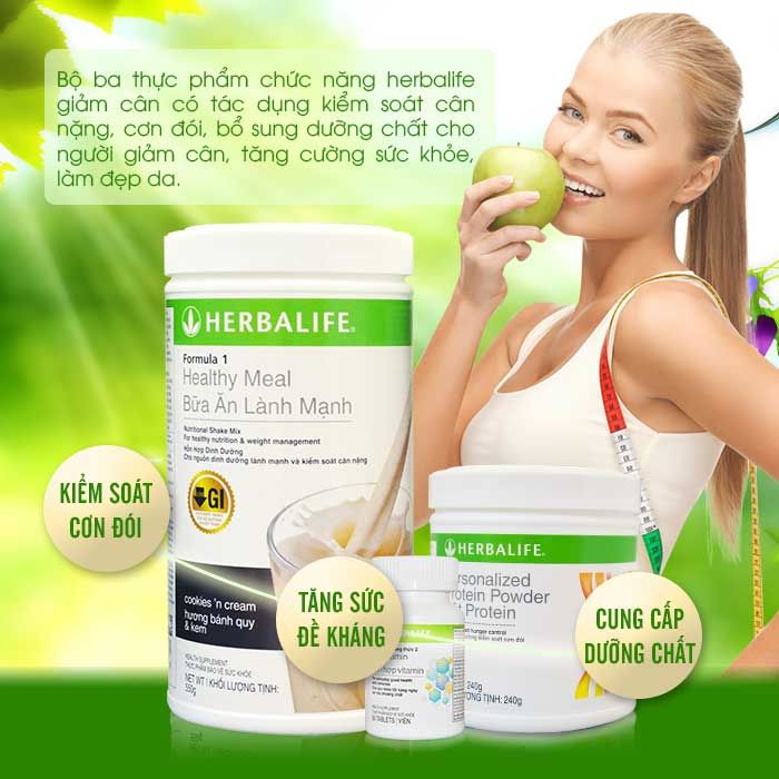Bộ 3 thực phẩm chức năng Herbalife là sự kết hợp của 3 sản phẩm bao gồm Sữa Herbalife Healthy Meal F1, MultiVitamin Herbalife F2 và Herbalife Power Protein. Mang hiệu quả, tác dụng bổ sung cho nhau, hỗ trợ cân bằng trọng lượng cơ thể, có tác dụng kiểm soát cân nặng, cơn đói, bổ sung dưỡng chất cho người giảm cân, hỗ trợ ngăn chặn béo phì, thừa cân, tăng cường sức khỏe, làm đẹp da.